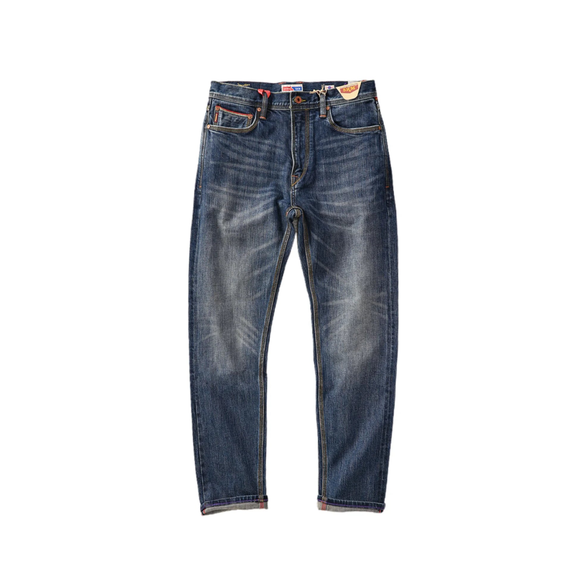 Cut in a slim straight fit, these 14oz selvedge jeans deliver both comfort and durability. The fabric shows clear slubby texture, giving a rugged hand-feel and unique fades over time. Triple-stitch construction reinforces key seams, while the vintage medium blue wash adds a timeless worn-in look that pairs with anything.